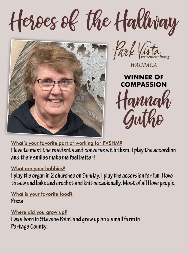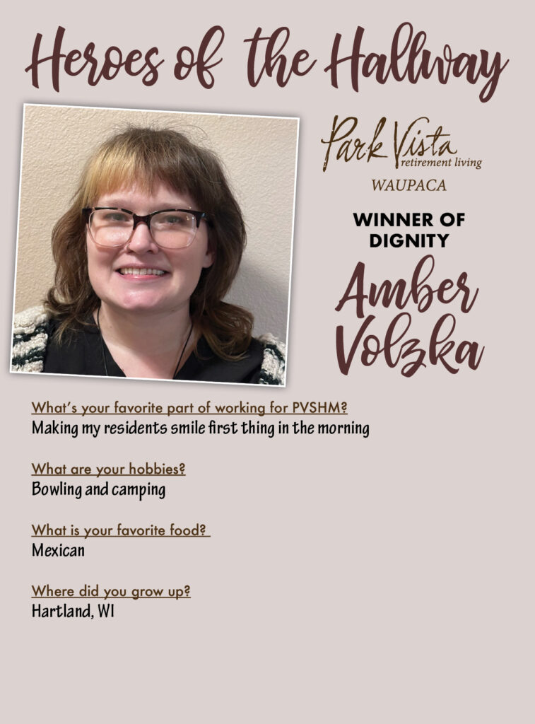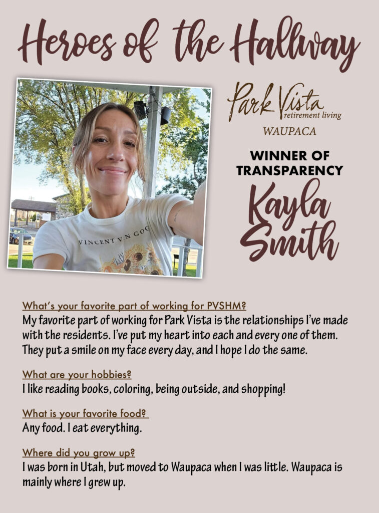 At Park Vista, our mission is “taking care of our loved ones with compassion and grace.” That’s what our team members focus on every day with all of our residents. It’s the dedication and hard work of our team members that we want to honor and highlight for their efforts. That’s why we’ve created our Heroes of the Hallway program.