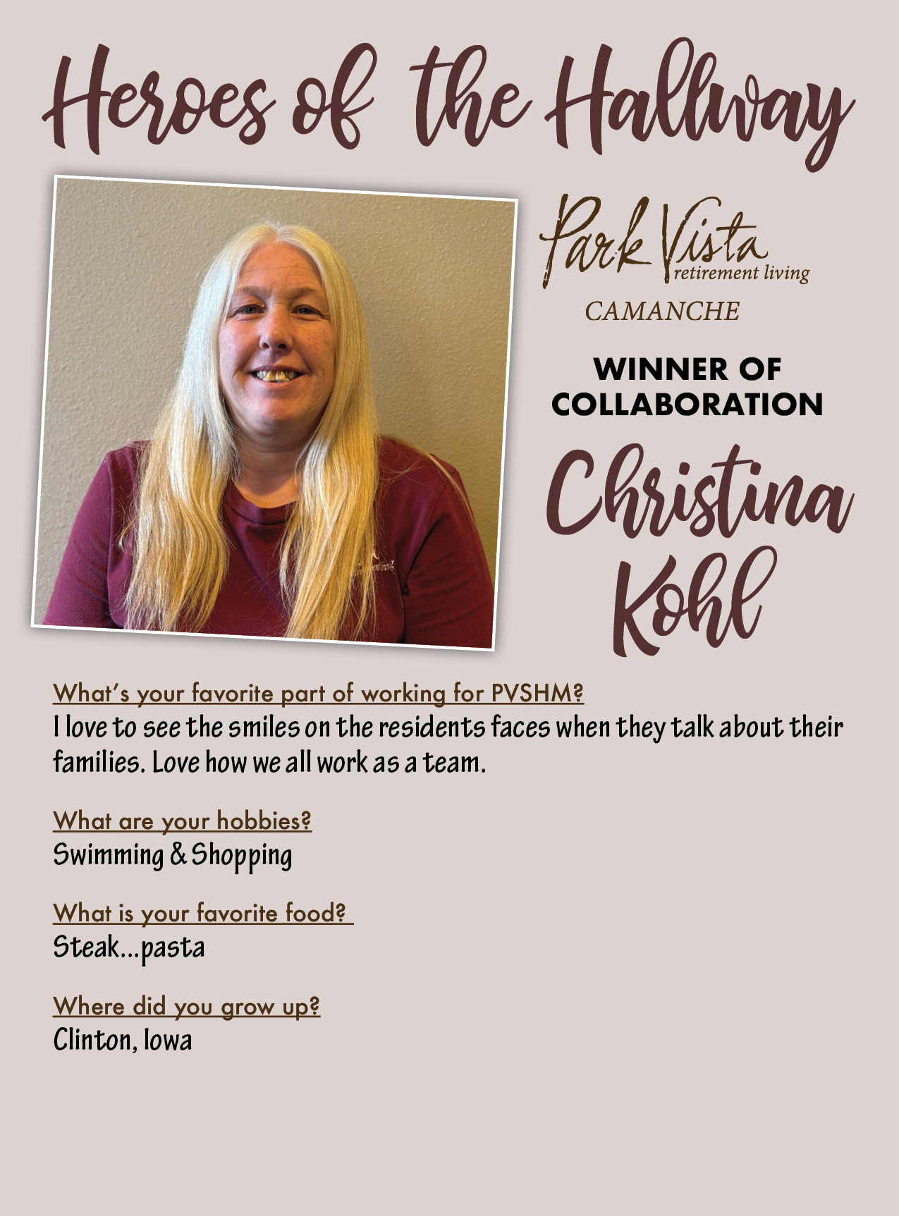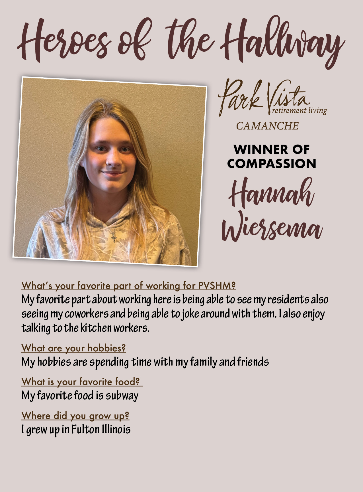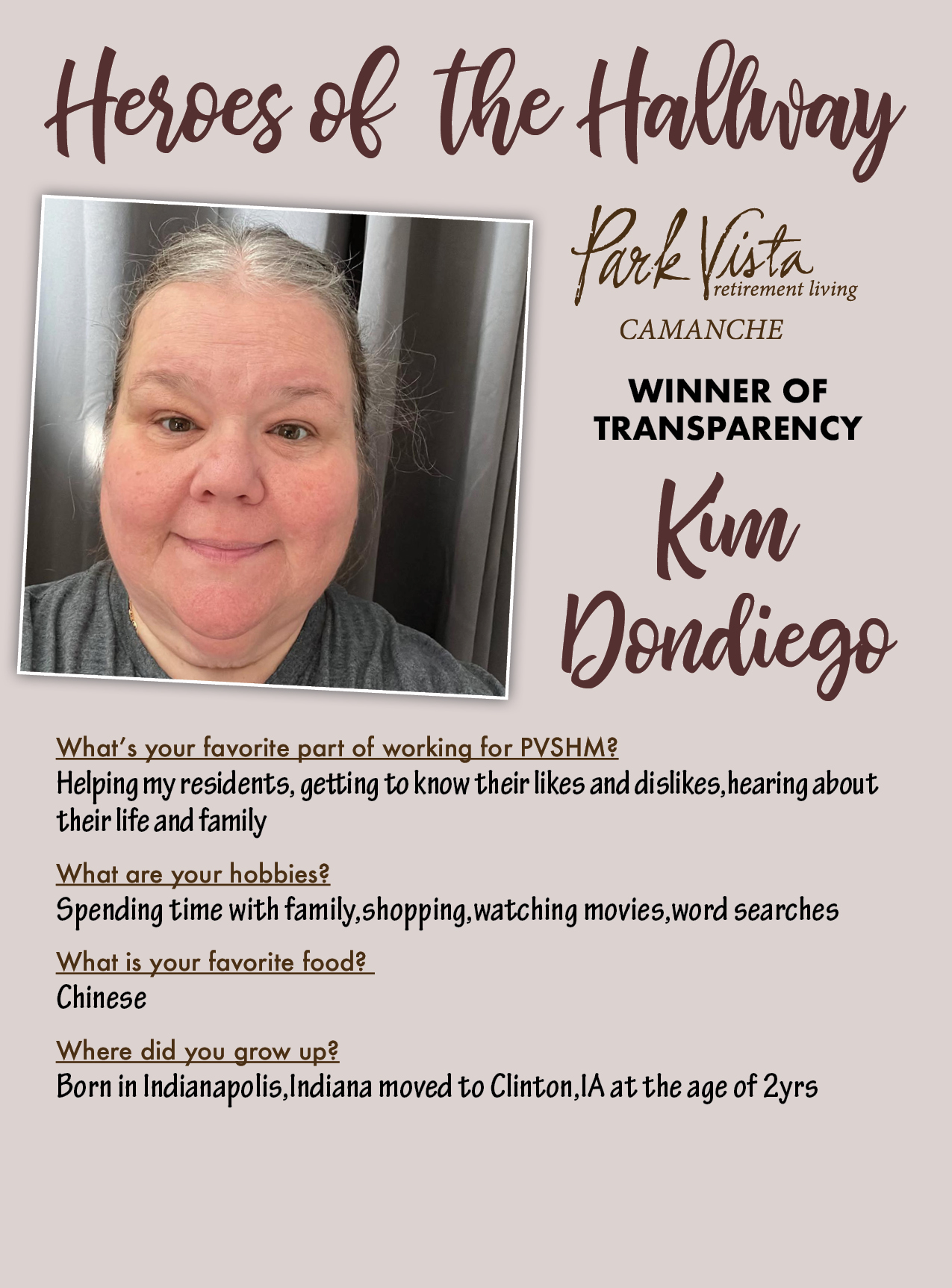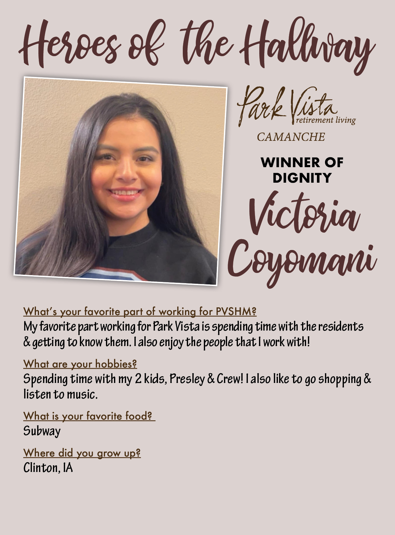At Park Vista, our mission is “taking care of our loved ones with compassion and grace.” That’s what our team members focus on every day with all of our residents. It’s the dedication and hard work of our team members that we want to honor and highlight for their efforts. That’s why we’ve created our Heroes of the Hallway program.